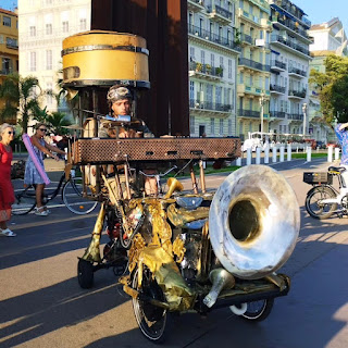 夕方、かっこいい楽器にまたがったパフォーマーと出くわす。ひとしきり演奏したあとは、車体のハンドルを握ってなめらかに去っていった。